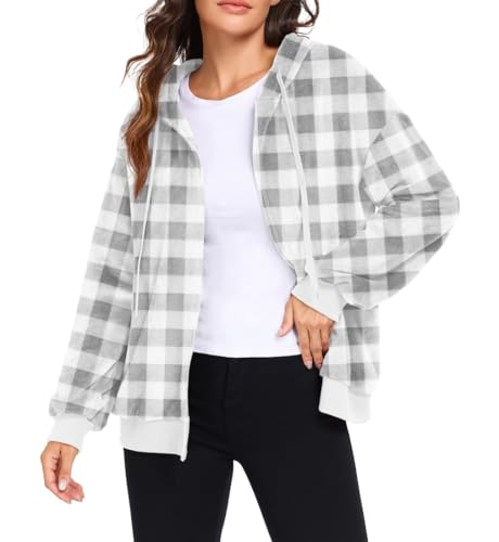 PrinStory Sweat à capuche zippé en polaire pour femme - Avec fermeture éclair - Manches longues - Veste à capuche d'hiver, Gris Petit motif à carreaux, L