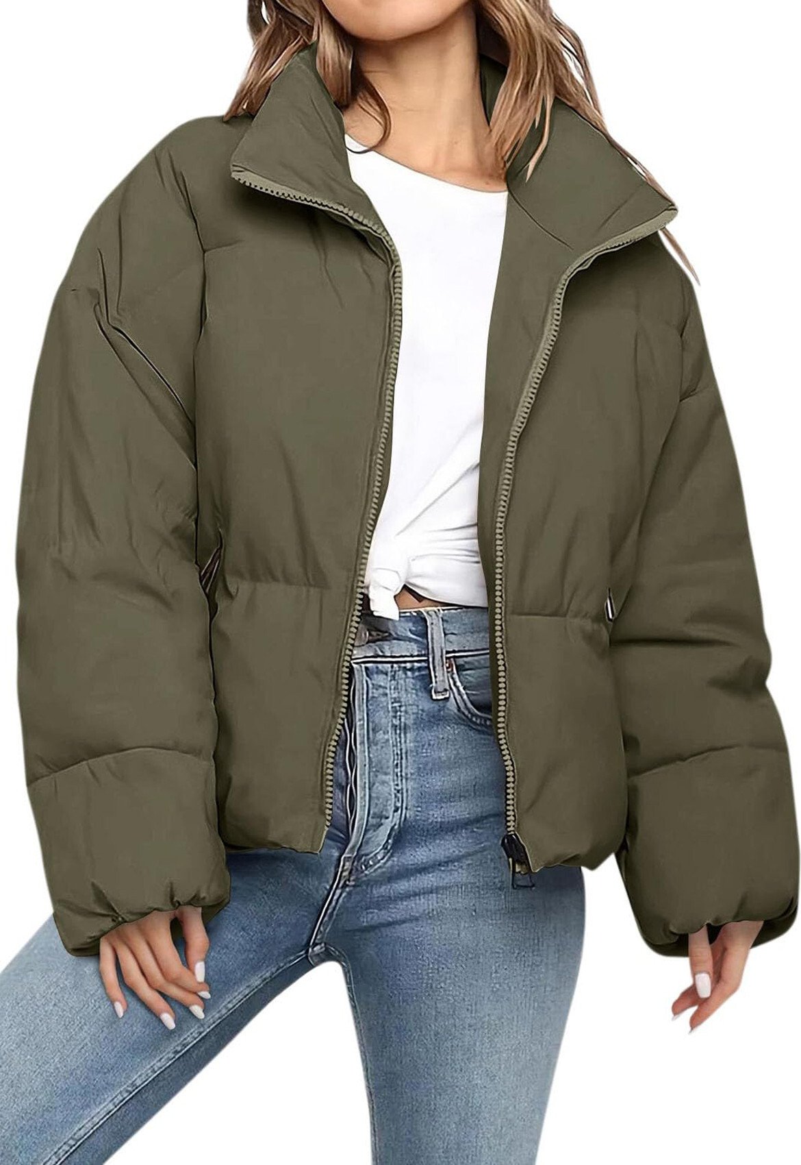 ASKSA Doudoune Femme Épaisse Chaude Courte Veste d'Hiver Piquée Fermeture à Glissière Veste à Col Roulant Unicolore Manteau d'Hiver Outdoor Doudoune (Vert Armée,L)