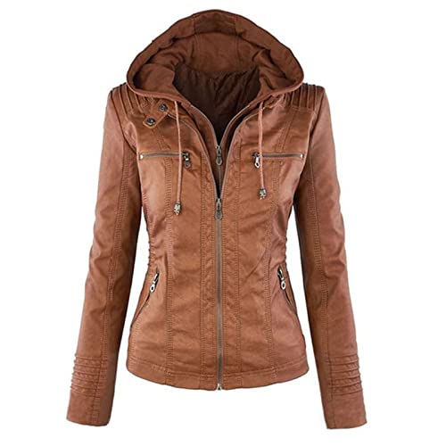 Oyrcvweuy Veste courte en cuir synthétique pour femme avec capuche amovible et fermeture éclair moto, marron, XXXL