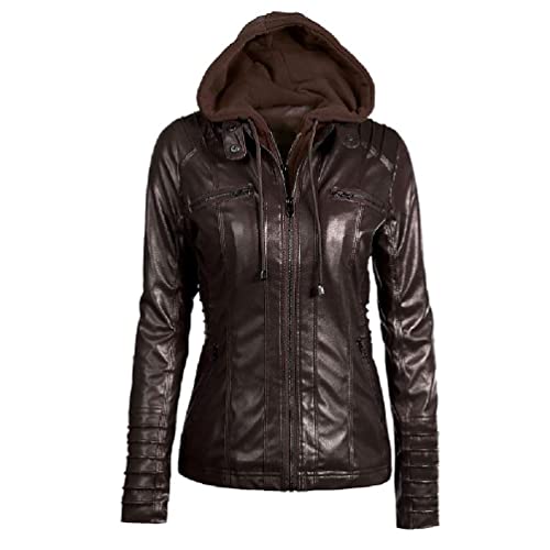 Oyrcvweuy Veste courte en cuir synthétique pour femme avec capuche amovible et fermeture éclair moto, café, XXXL