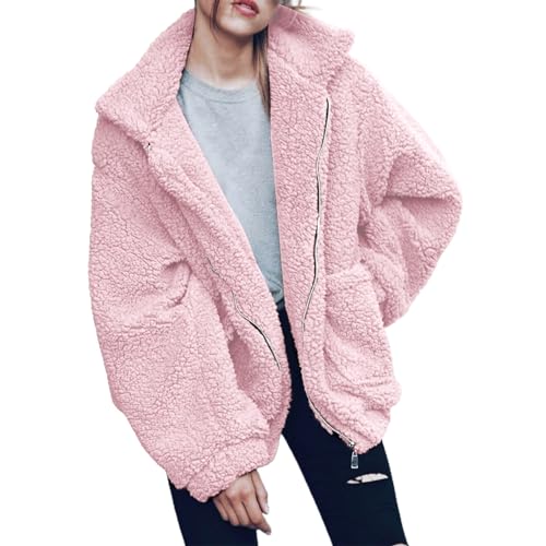 Veste Courte à Revers Chaude pour Femme, Veste Décontractée à Manches Longues en Polaire Sherpa Boutonnée Et Duveteuse, Manteau à Revers Cranté avec Poches (Rose,S)