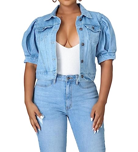 Veste Jean Femme, Veste en Jean À Manches Courtes Bouffantes pour Femme Manteau en Jean Court Boutonné À La Mode Manteau en Jean Vintage Délavé Délavé Été Jean Shrug Jacket Tops pour Dames