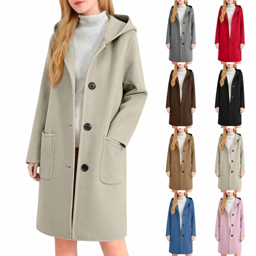 Manteau en laine pour femme Manteau d'hiver pour femme Long Chaud Élégant avec capuche Poches et boutons Veste d'hiver mi-longue Automne Veste de transition doublée Manteau en laine Veste de loisirs