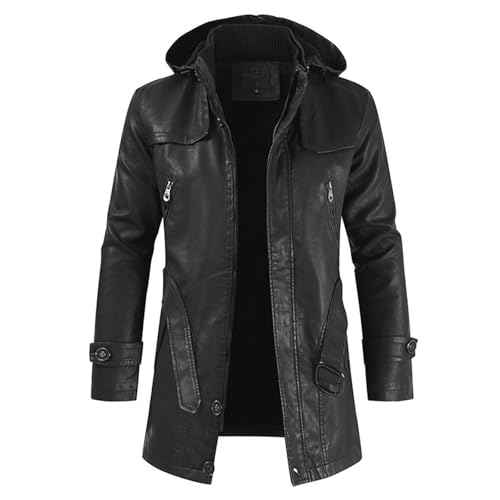 Hommes Capuche Veste en Cuir Hiver Vintage Moto Polaire Chaud Moto Pilote Manteau en Cuir, Black, XL