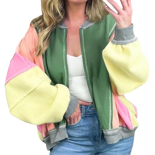 Veste Baseball Femme, Blouson Femme Hiver Ete,Veste Oversize Pour Femme Avec Blocs De Couleurs Et Fermeture éClair Sweat à Capuche Manteau D'Automne DéContracté Et Ample Avec Poches