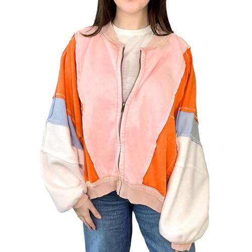 Veste Baseball Vintage Femme, Veste Femme Mi Saison,Veste Oversize pour Femme avec Blocs De Couleurs Et Fermeture éClair Sweat à Capuche Manteau d'automne DéContracté Et Ample avec Poches