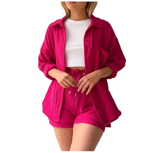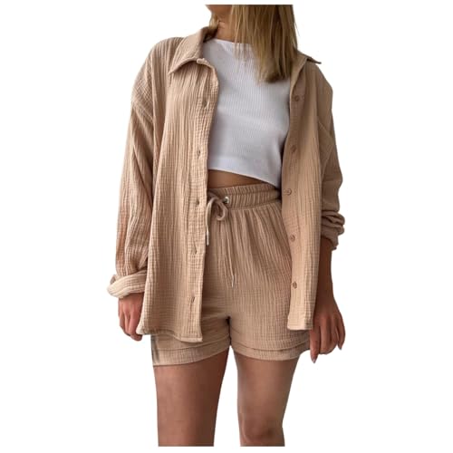 Tenues d'été pour femme - Pyjama à manches longues - Ensemble 2 pièces en mousseline - Ensemble ample pour survêtement en lin - Veste longue et légère - Vêtement de détente - Chemisier et short de gym