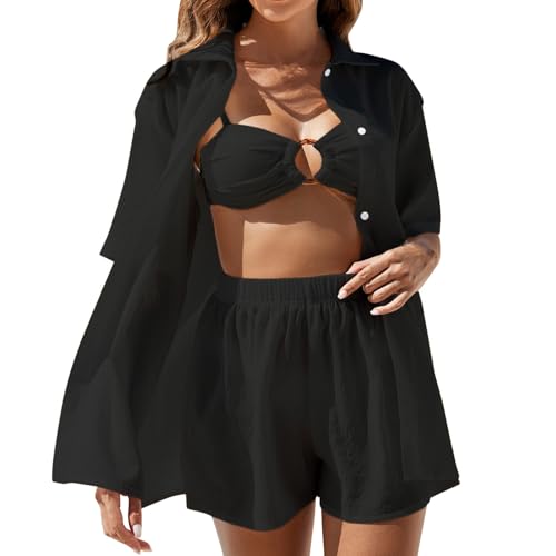Tenue d'été pour femme - Pyjama à manches longues - Ensemble 2 pièces - En mousseline - Ensemble ample pour survêtement en lin - Veste longue et légère - Vêtement de détente - Chemisier et short de