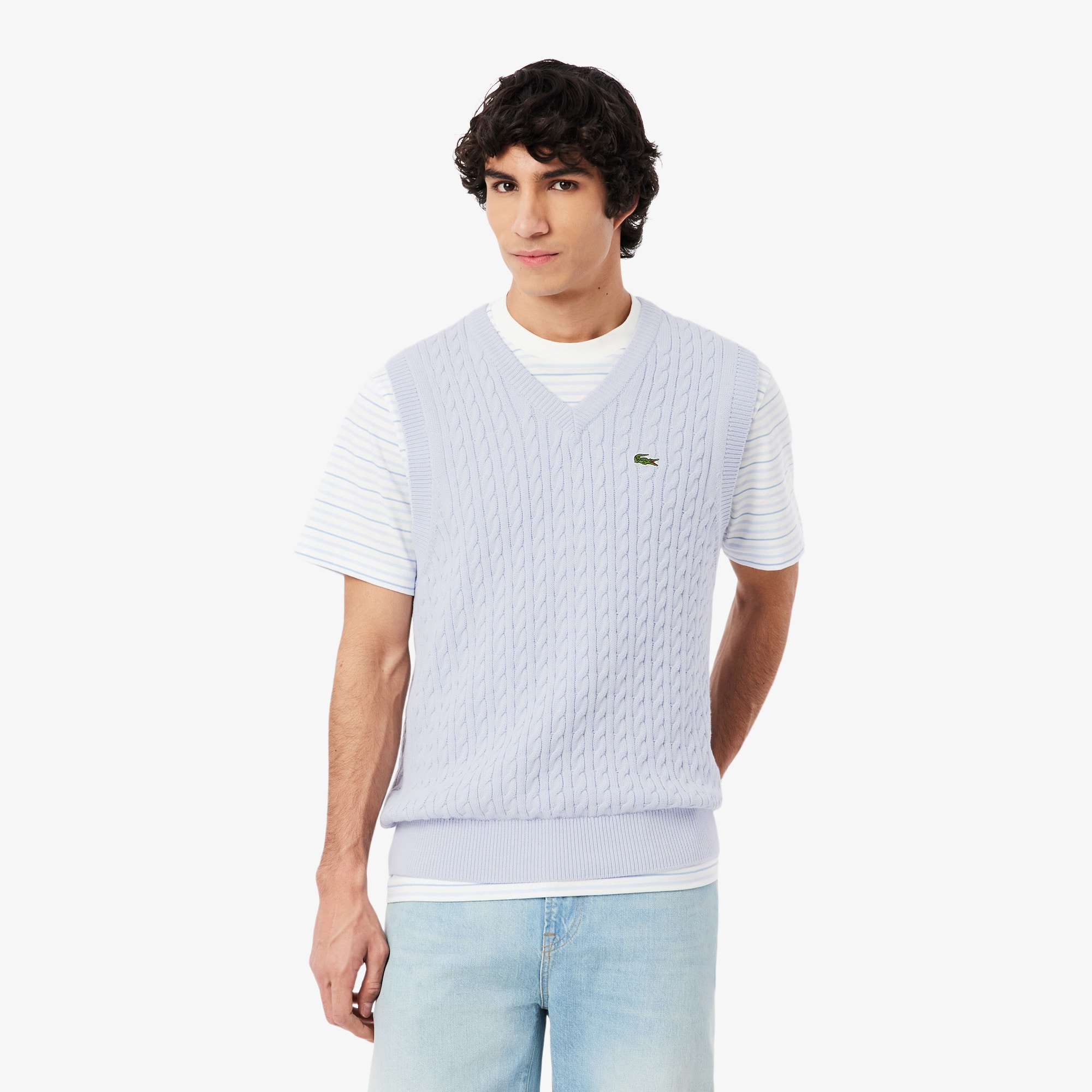 Lacoste Pull sans manche torsadé coton Taille L Bleu Clair/blanc