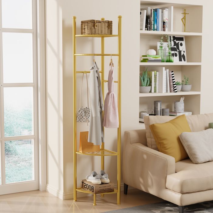 Porte Manteau sur Pieds d’Angle Portant à Vêtements en Métal Doré Vestiaire d’Entrée pour Chambre Salon 44.5x174cm