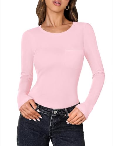 Aottori sous Vêtement Thermique Femme Manches Longues T Shirt Col Rond Élégant Haut Côtelé avec Poche Slim Fit Top Basic Extensible Respiratoire Décontracté Rose S