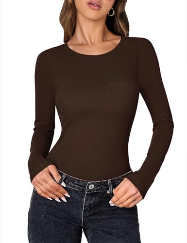 Aottori sous Vêtement Thermique Femme Manches Longues T Shirt Col Rond Élégant Haut Côtelé avec Poche Slim Fit Top Basic Extensible Respiratoire Décontracté Brun S