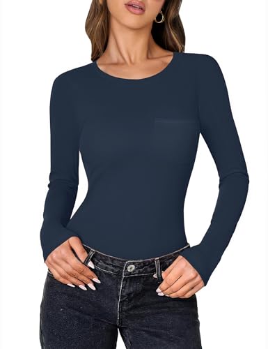 Aottori sous Vêtement Thermique Femme Manches Longues T Shirt Col Rond Élégant Haut Côtelé avec Poche Slim Fit Top Basic Extensible Respiratoire Décontracté Bleu Marine S