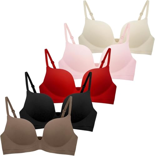 Nogkdyc Soutien-Gorge 5pcs Adolescente Filles 10-18 Ans Soutien-Gorge rembourré 3pcs sous-vêtements sans Couture avec bandoulière réglable et Amovible(36/Noir + Marron + Rose + Champagne + Rouge)