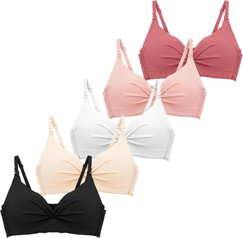 Nogkdyc Soutien-Gorge 5pcs Adolescente Filles 10-18 Ans Soutien-Gorge rembourré 3pcs sous-vêtements sans Couture avec bandoulière réglable et Amovible(34/Noir + Blanc + Rose Clair + Peau + Rose)