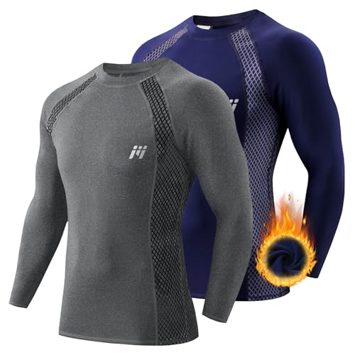 MEETWEE Tee Shirt Thermique Homme, Manche Longue Maillot de Compression Base Layer sous-Vêtements Thermique pour Sports Ski Running Lot de 2, Gris et Bleu, Taille L