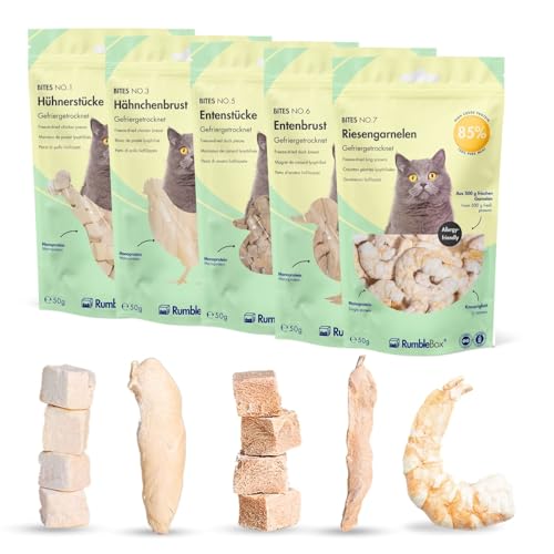 RumbleBox Ultimate Box Pur Poulet, Canard et crevettes géantes, 100% Viande, friandises lyophilisées pour Chats sans céréales ni Sucre pour Les Animaux allergiques, Un Seul INGRÉDIENT (5 x 50 g)