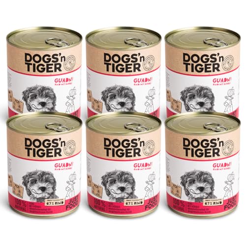 Dogs'n Tiger Lot de 6 boîtes de nourriture pour chien au guadn - Formule adaptée aux animaux - Avec 67 % de viande de bœuf, d'huile de lin et d'herbes - Sans sucre, céréales et arômes artificiels - 6