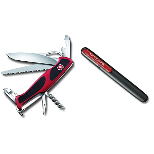 Victorinox Ranger Grip 79 Couteau de Poche Suisse, Multitool, 12 Fonctions, Lame Fixe, Ouverture Une Main, Rouge/Noir & Aiguisoir Double pour Couteaux, Swiss Made, Portable, Noir/Rouge