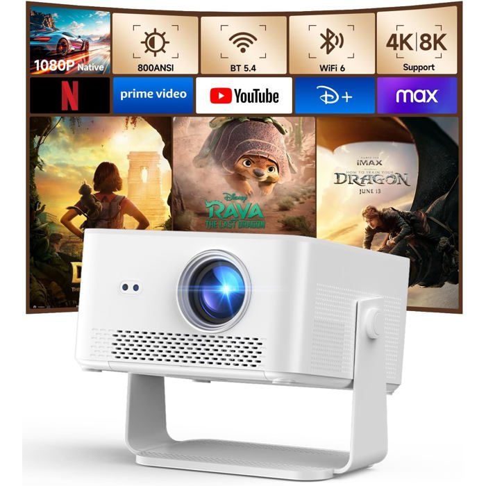 Reagle R-MOVIELUM-P41 Vidéoprojecteur Full HD 1080p 8K Upscaling, 900 ANSI LED Projecteur Portable 140 Pouces Android 14 Wi-Fi 6 Bluetooth 5.4 Auto Focus Keystone HDMI USB Smart TV 180° Rotatif Home