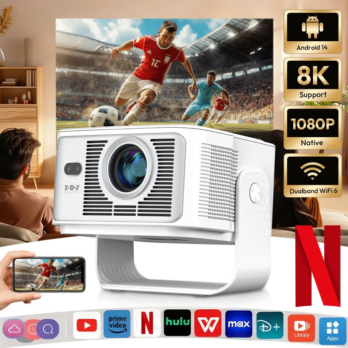 Vidéoprojecteur Support 8K Android 14 Auto Focus/Keystone Smart Projecteur 900ANSI WiFi6 Bluetooth5.4 1080P Native FHD HDMI/USB