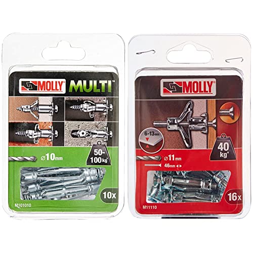 Molly M101010-XJ Molly Multi Chevilles métal avec vis agglo, Gris, Set de 10 Pièces & M11110-XJ Chevilles métalliques à expansion avec vis M5 Ø11mm, 5 x 36 mm, Gris, Set de 16 Pièces