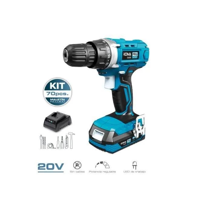 Kit Perceuse Visseuse 20v Avec 70 Accessoires - Koma Tools - 2 Vitesses Variables - Mandrin sans Clé de 10mm