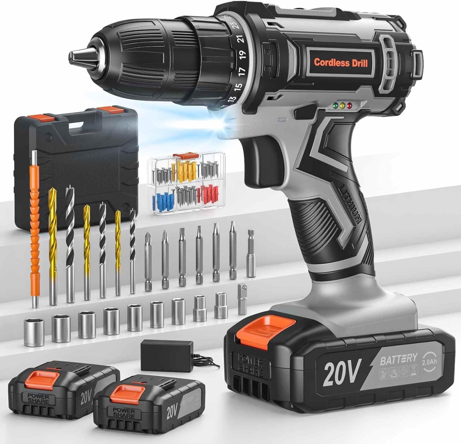 JEXNOVASHOP-Perceuse Visseuse Sans Fil 20V, Visseuse Devisseuse Sans Fil, 2 Batteries 2000mAh, 89 Accessoires et Valise, LED, 42Nm Perceuse-Visseuse, 25+1 Réglages de Couple, 2 Vitesses, pour la Bric
