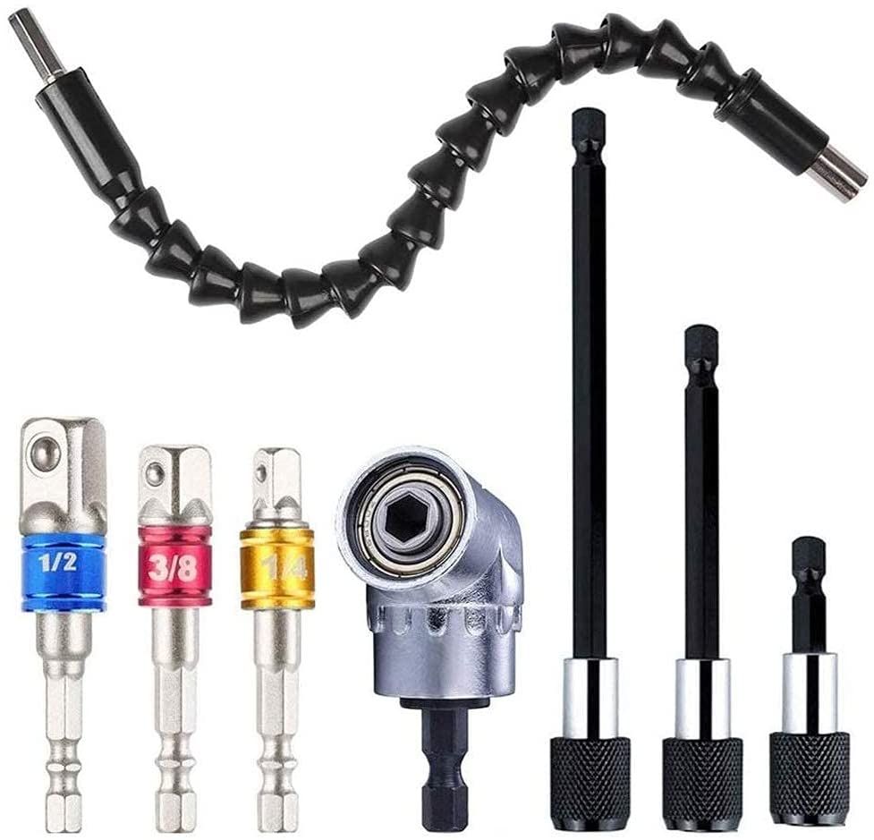 Accessoires de tours, Porte Embout Magnetique Visseuse,3 pcs Embouts de Tournevis Magnétiques à Tige Hexagonale+1 Foret à Angle Droit +1 D'extension d'angle Flexible Mandrin Perceuse+ 3 Embout Visseuse a Choc