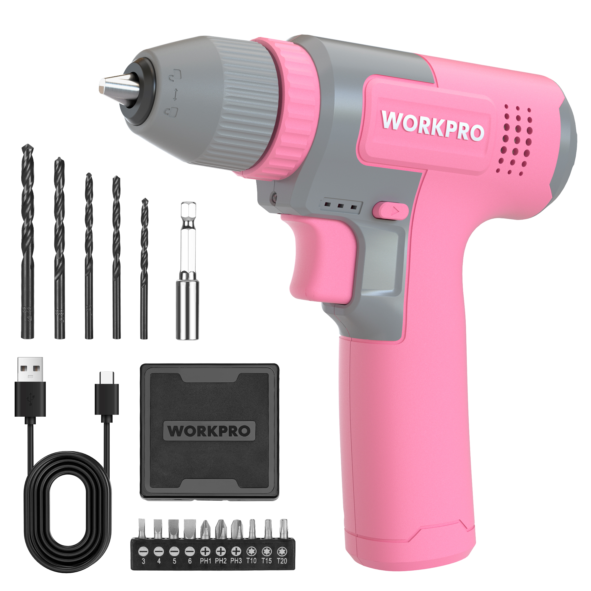 Kit de Perceuses Visseuse Sans Fil 8V Rose WORKPRO, Visseuse Devisseuse Sans Fil 2000mAh, Couple 12Nm, Mandrin de Percage 10mm, LED Lumiere, Kit d'Accessoires Complet, pour Reparation Maison DIY