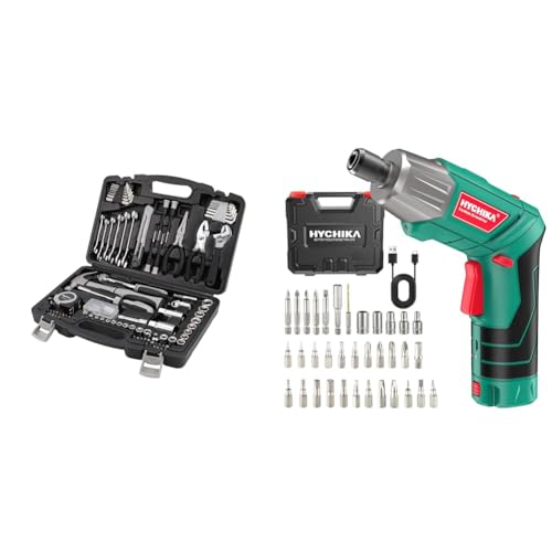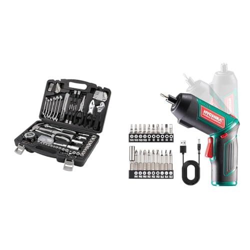 Amazon Basics Coffret d’outils à main 131 pièces pour la maison & Visseuse Sans Fil 6Nm, HYCHIKA Visseuse Devisseuse sans Fil 2000mAh 3.6V avec 20 accessoires, lampe LED, mandrin magnétique, chargeur