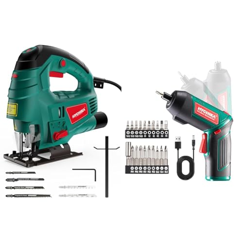 Scie Sauteuse HYCHIKA 800W, Avec Moteur en Cuivre Puissant, 800-3000SPM Tours & Visseuse Sans Fil 6Nm, HYCHIKA Visseuse Devisseuse sans Fil 2000mAh 3.6V avec 20 accessoires, lampe LED, mandrin