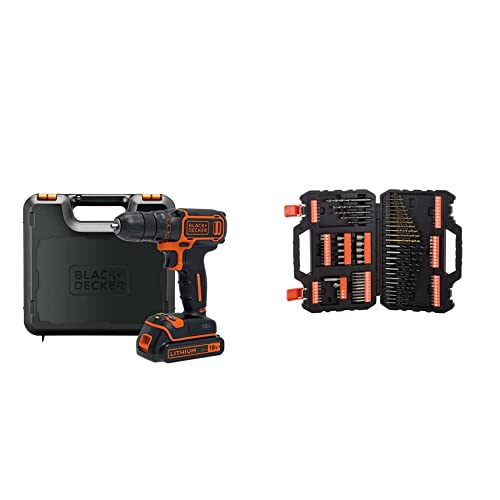 BLACK+DECKER Perceuse Visseuse Sans Fil 18 V Li-Ion avec Chargeur - Inclus 1 Batterie 1,5 Ah Livrée en Coffret - Pour le Metal, le Bois et Tâches de Visage & Coffret de Perçage et Vissage, Noir
