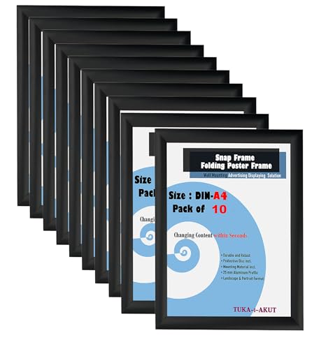 TUKA-i-AKUT 10x A4 Cadre à Clipser en Aluminium, Profilé Aluminium 25 mm Cadre pour Affiche Photo Poster, Cadre d'Affichage avec Vitre de Protection, Matériel de Fixation Noir Couleur TKD8420-A4-10X