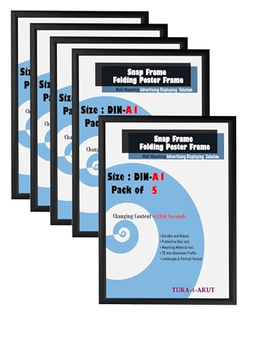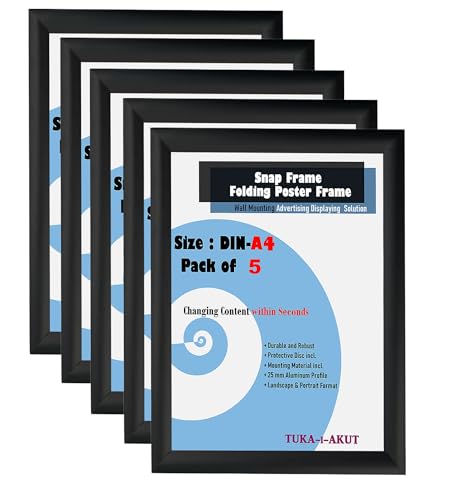 TUKA-i-AKUT 5x A4 Cadre à Clipser en Aluminium, Profilé Aluminium 25 mm Cadre pour Affiche Photo Poster, Cadre d'Affichage avec Vitre de Protection, Matériel de Fixation Noir Couleur TKD8420-A4-5X