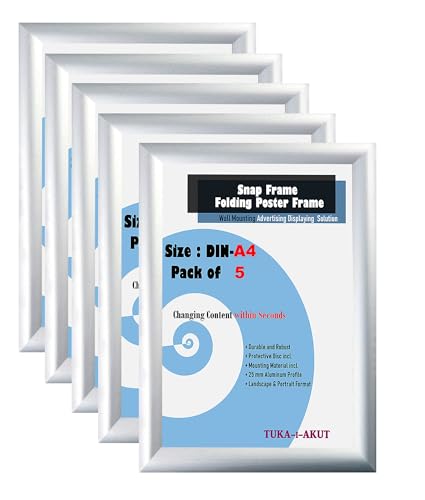 TUKA-i-AKUT 5x A4 Cadre à Clipser en Aluminium, Profilé 25 mm pour Affiche Photo Poster, Avec Vitre de Protection, Matériel de Fixation Argent Couleur TKD8420-A4-5X
