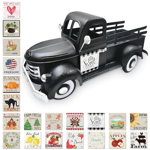 Décoration Porte Bonheur, Décoration de Jardin de Voiture, 34cm Pot de Fleurs en Métal avec 20 Aimants Saisonniers pour la Maison, Décoration de Table, Balcon, Cuisine, Vitrine de la Terrasse, Noir