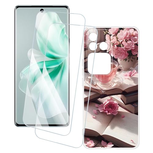 OAGELIM 2 Pack Protège-Écran + Coque Compatible avec Vivo V30 Pro 5G (6.78 Pouce) Coque Impression Artistique Personnalisée et Film Verre Trempé (Après-midi Rose)