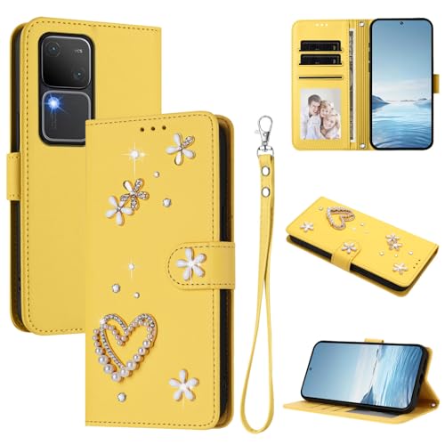 Jiajihua Coque Compatible avec Vivo V30 / V30 Pro,Compatible avec Vivo S18 / S18 Pro Lanyard【Porte-Cartes Portefeuille Couvercle Rabattable Boucle magnétique Support】 Yellow