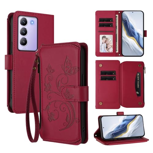 XFDSFDL® Étui pour Vivo V30 SE/ V30 Lite/ V40 SE (6,67 Pouces) Lanière PU Cuir Housse Fleur Papillon Motif avec Supports et Fermeture Eclair Fente Carte Portefeuille Protection Coque Rouge