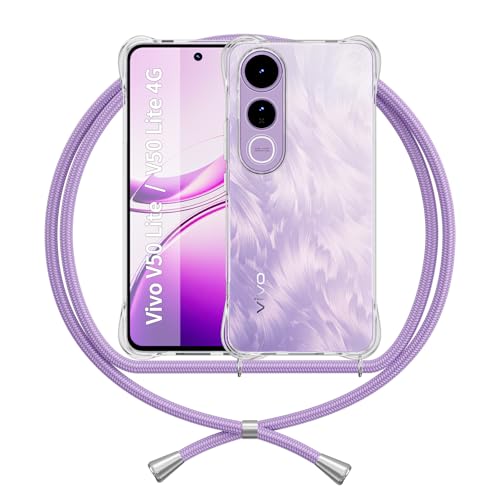 ANFAIRLACE Coque Compatible avec Vivo V50 Lite 5G Cordon, Transparente Étui Lanyard Anti Jaune TPU Housse Clear Case Shockproof Cover, Pourpre