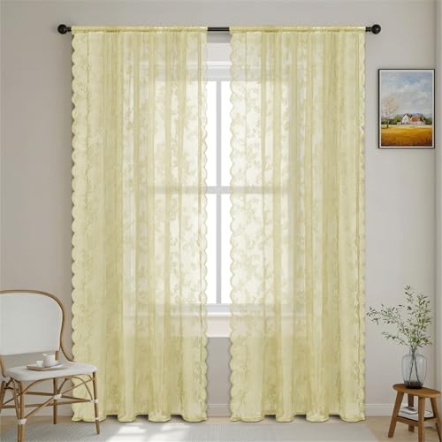 Surwin Rideau Voilage Dentelle de Couleur Unie, Rideaux Lot de 2, Voiles Intérieurs Voilage Fenetre, Rideaux Voilage Moderne pour Décorer Salon,Chambre,Cuisine,Fenêtre (Jaune Clair,100x100cm)