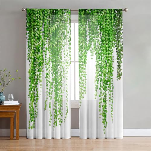 Surwin Rideau Voilage Imprimé Plante Verte, Rideaux Lot de 2, Voiles Intérieurs Voilage Fenetre, Rideaux Voilage Moderne pour Décorer Salon,Chambre,Cuisine,Fenêtre (Vert,132x182cm)