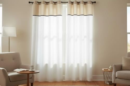 Atout Ciel Voilage Bicolore 140x240 cm – Rideau Transparent avec Bande Décorative – 8 Œillets Métal – Voilage Moderne pour Salon et Chambre – Rideau Léger et Lumineux, Blanc et Beige