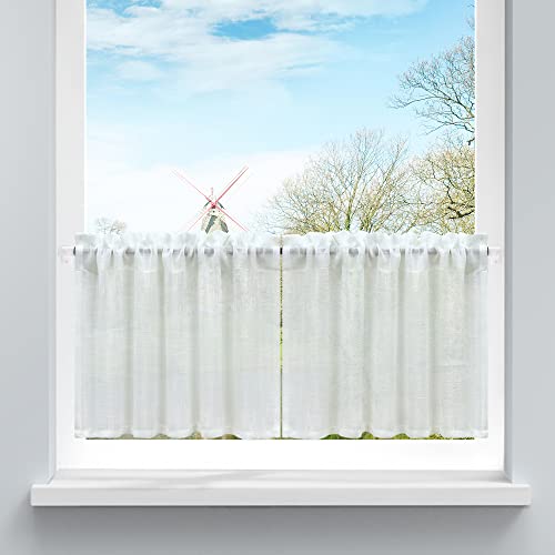 MRTREES Rideau Voilage Blanc Effet Lin Court de Cuisine Voilage Petite Fenetre 140x145 CM, Rideaux Voile Blanc Courts Semi-Transparent à Oeillets pour Salon Chambre Baie Vitrée, 2 Pièces