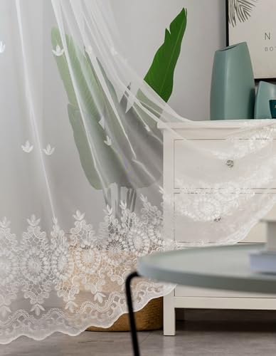 Beydodo Rideau Voilage pour Petite Fenêtre, Rideaux Passe Tringle Lot de 2 86x115cm, Rideau en Polyester Uni Blanc à Broderies Florales Vintage