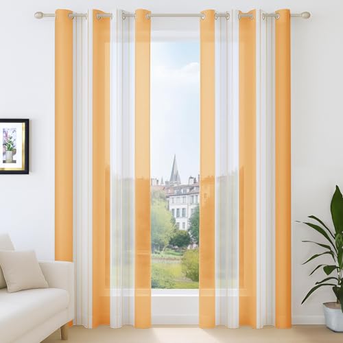 MIULEE Rideaux Voilage à Rayures Blancs et Orange, Voilages Intérieurs avec Oeillets, Beaux Voile Rideau Voilage Fenetre Chambre, Lot de 2 Transparent Rideaux Salon Hauteur 215 CM