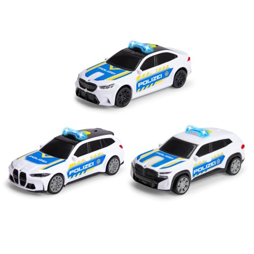 Dickie Toys BMW Police Cars 1:36 (15 cm), Voiture de Police pour Enfants à partir de 3 Ans, Friction, lumière et Son, Try Me, Licence Officielle BMW, 3 Compartiments, sélection aléatoire