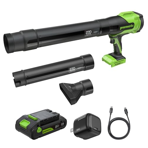 Greenworks 24V Souffleur sans Fil avec Batterie 4Ah & Chargeur Rapide 65W PD, 209km/h 7,65m³/Min Souffleur Électrique Puissant pour Jardin, Terrasse & Voiture, Vitesse Variable BL1002HA1