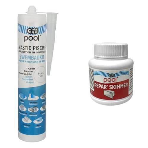 GEB Mastic étanche spécial Piscine Blanc 290 ML pour Coller, jointoyer et réparer & Réparation Skimmer de Piscine, buse de refoulement, bonde de Fond et Toutes pièces en ABS - Pot 125 ML - Répare